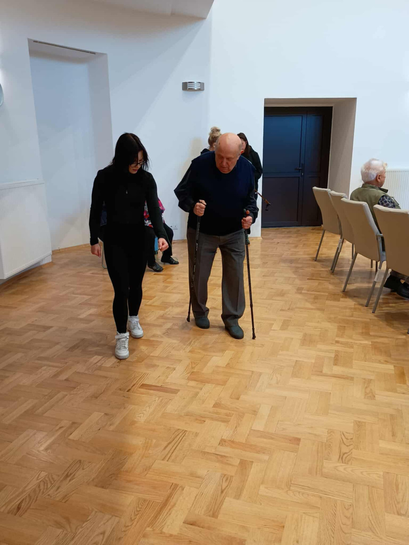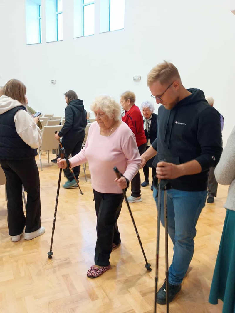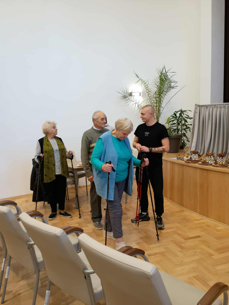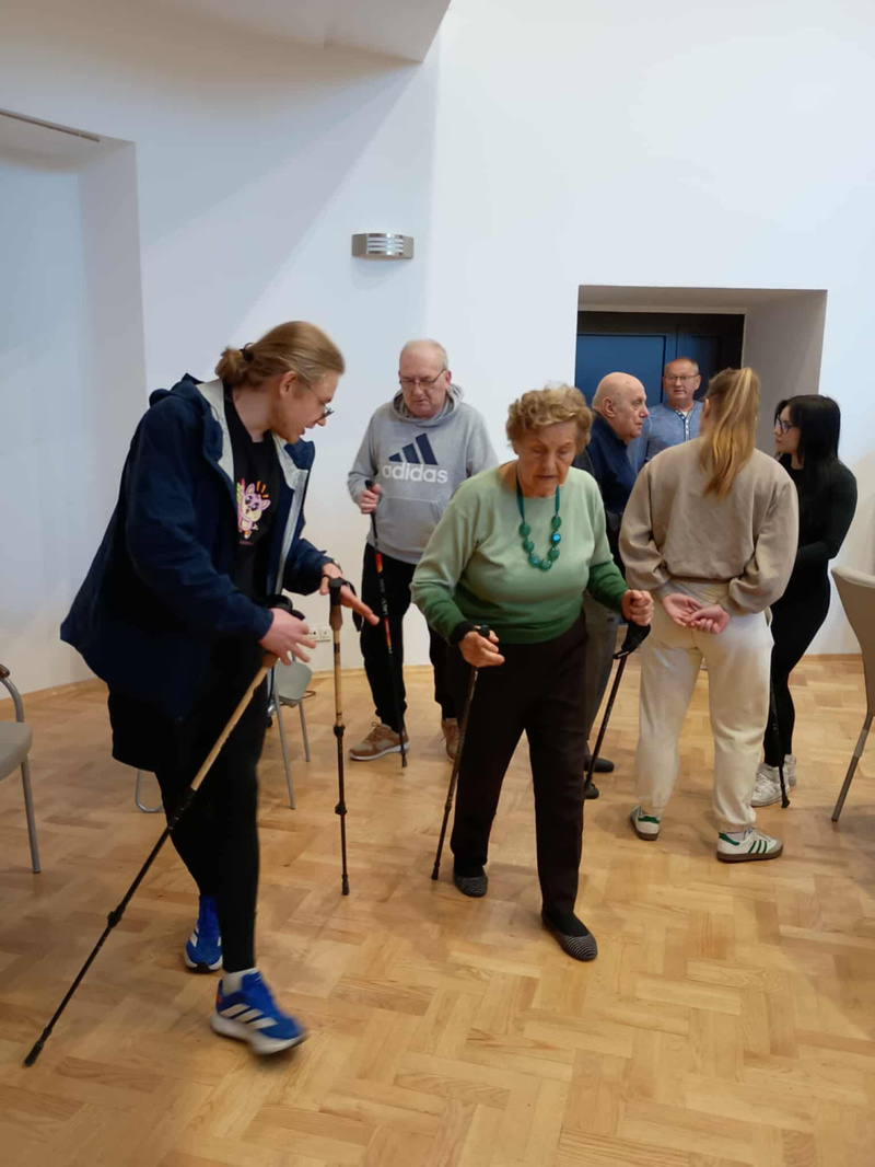 Podczas spotkania przyszli fizjoterapeuci prowadzili zajęcia edukacyjne oraz praktyczne warsztaty, ucząc seniorów m.in. techniki chodzenia z kijkami nordic walking – jednej z najbezpieczniejszych i najskuteczniejszych form aktywności fizycznej dla osób w wieku senioralnym.